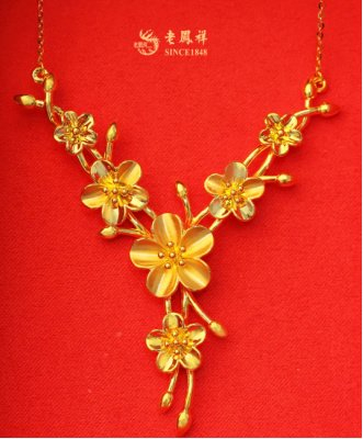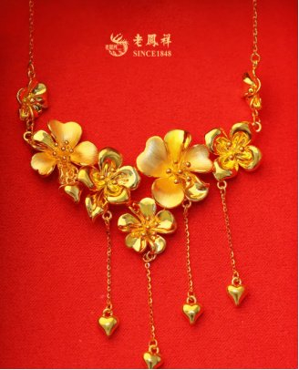 “锦绣繁花・黄金链牌”以璀璨足金勾勒花朵柔美轮廓,花瓣纹理细腻如凝晨露,鲜活灵动;搭配灵动垂坠的心形金饰,每一处细节都透着优雅华贵,举手投足间尽显古典雅致与璀璨风华,既是日常穿搭的点睛之选,也是重要场合的亮眼配饰。